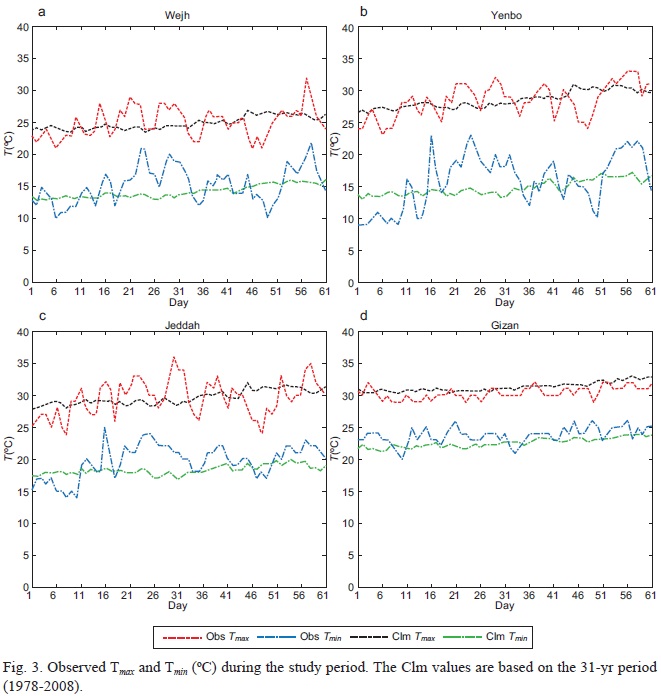 Figure 3 provides some further finer details of the relative comparison between the observed Tmax and Tmin (during the study period) and the Clm based same-temperature variables for all the four stations. On average, fluctuations in observed Tmin are larger as compared to those in Tmax and these are smallest for the station at Gizan. This is in part indicative of a more dominating influence of the Mediterranean based weather system for stations located in northern SA (Vincent, 2008).
