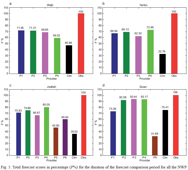 Figure 5 displays the normalized total F as percent (F%) using Eq. (2) for 61 days and nights for Wejh, Yenbo, Jeddah and Gizan, for all the NWP model forecast providers. All the NWP model forecast providers including Clm have either under- or over-estimated the observed temperature (since F < 100%). For the city of Wejh (Gizan), P1 (P3) and P2 (P4), have performed almost similarly. Overall, the relative best performer is P3 for the city of Gizan, with a difference less than -6.6% (the city of Gizan is in the southernmost region of SA, with an elevation of only 4 m).