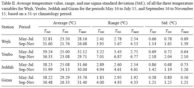 Table II displays the three key statistics for a selected non-transitional period during summer and during the second transitional period, for all the three temperature variables, based on the 31-yr period Clm. The relatively larger difference in the range as well as in the observed one sigma standard deviation during the second transitional period is evident as compared to the non-transitional period. During the second transitional period, Tmax is in the upper 30s, except for the station at Wejh, where it is in the lower 30s.