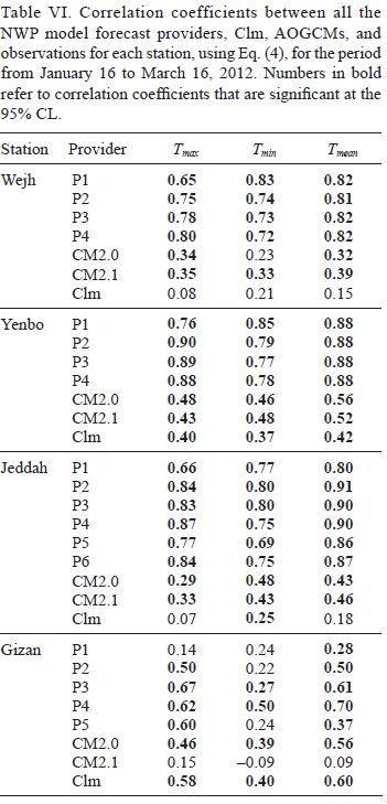 The CC value for the NWP model forecasted Tmax and Tmin with the corresponding observed Tmax and Tmin is better than Clm at the 95 % confidence level (CL), except for the station at Gizan for P1, P2 and P5, where Clm performed better (Table VI). In fact, Figure 4d indicates that there is an almost out of phase relationship between the forecasted and observed Tmean for the city of Gizan for P5. In general, these observations are indicative of good agreement between two different measures to compare the NWP model-based forecast skill, although caution needs to be exercised for such a comparison (Murphy, 1988). To some extent, this is indicative of the contemporary challenges faced by the NWP models to mimic the surface temperature for stations in mountainous terrains. As pointed out earlier, a relevant remark may be the climatological vicinity ofthe active Sudan low/ Red Sea trough during the spring season for Gizan (Almazroui et al. 2012c, and references therein).