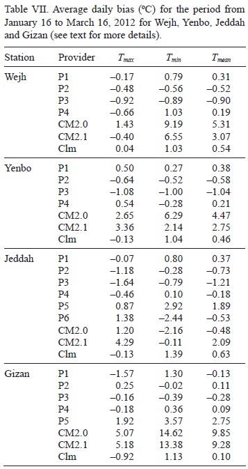 Table VII displays the average daily bias relative to Obs for all the NWP model output providers, including the two versions of the AOGCM. In general, mostly the NWP model-based providers' temperature forecasts displayed a cold bias. The largest (smallest) absolute bias was displayed by P5 (P2) for Gizan for Tmin, amounting to 3.57 °C (0.02 °C). These findings may be of more relevance if applied to socio-economic sectors, such as the tourism sector.