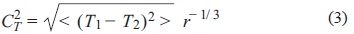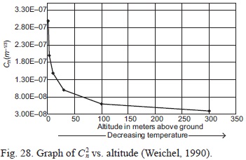 where p is the atmospheric pressure in millibars and < > represents the ensemble average. C2T is a measurable quantity defined by temperature differences T1 and T2, between two reference points separated by a distance r. C2n is a parameter which changes as a function of altitude and alters the behavior of the aberrations. The following characterizes the optical energy of the turbulence and measures the atmospheric turbulence contributions for a wave that propagates through it. AsC2n increases, so does the effect of the aberration. Typically, C2n decreases in relation to altitude (Andrews and Phillips, 1988). The refractive index structure coefficient alone provides adequate information about the turbulent region and typically ranges from 10-17 m-2/3 or less for weak turbulences to 10-13 m-2/3 or more for strong turbulence (Andrews and Phillips, 1988; Weichel, 1990).