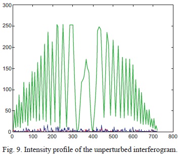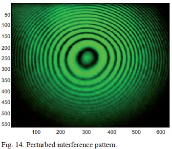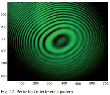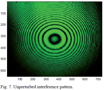 Numerous experiments were performed over a number of days and the consistency of the interferograms was analyzed. The averaged results are reflected on the following pages, split into five categories. Five interferograms are depicted on the subsequent pages. Section 5.1, corresponding to the first reading, includes the data for the unperturbed laser beam at a room temperature of 23.1 °C (Figure 7). Sections 5.2 to 5.5 (corresponding to readings 2 to 5) present the data for the perturbed laser beam, which was subjected to thermal turbulence of35, 45, 55, and 65 °C, respectively.