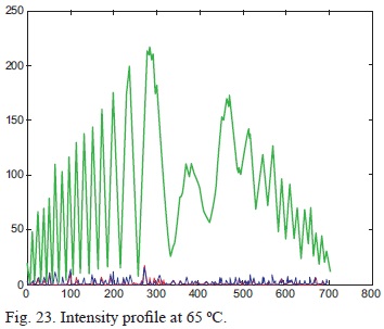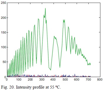 Reading 3 was conducted at 45 °C, 21.9 °C above room temperature within the turbulent region. The interferogram in Figure 14 shows signs of distortion, defocus and blurring. The intensity profile still assumes a Gaussian profile in Figure 15 with minor energy redistribution between 100 and 150 units. The lower spatial frequencies in Figure 16 are beginning to darken, which indicates that phase shifts are becoming more distinct with the increasing temperature. The darker line running down Figure 17 shows a redistribution of the spatial domain in the interferogram, which corresponds to both image blur and image defocus. Banish et al. (1990) describe a similar scenario, which has been inferred in this work.