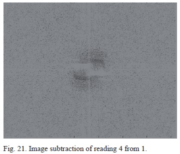 Reading 4 is 31.9 °C above room temperature inside the turbulent region. The interferogram shows signs of deformity at the centroid and non-uniformity between the spacing of the nodes and anti-nodes. A phenomenon described by Andrews et al. (2005) known as beam jitter, which describes the movement of the beam around the unperturbed region, is evident here. The lower spatial frequencies in Figure 19 do not coincide well with the original unperturbed FFT. This implies defocus and image blurriness (Banish, 1990), which can be directly seen from the interferogram, possibly resulting from redistribution of power spatially in time due to the thermal fluctuations (Shaik, 1989). Energy redistribution over the beam in Figure 20 is severe over the 500 to 700 units region, with an overall maximum energy peak of less than 250 units. This redistribution of beam energy is known as beam spread (Andrews et al., 2005). The image subtraction data in Figure 21 shows signs of darkening around the centroid. The severity of the image distorsion and image blur are becoming more evident.