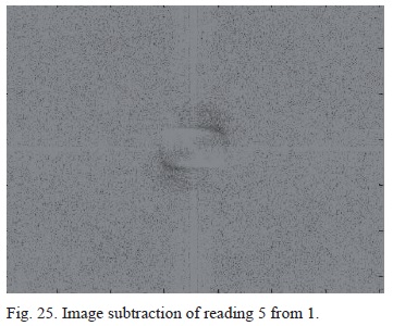 Reading 5 presents the results of the most extreme temperature achievable using the heated panel.At 65 °C, the laser beam is exposed to thermal heat radiating at 41.9 °C above room temperature. The interferogram in Figure 22 shows signs of image blurring, defocus and shape distortion (beam jitter). The intensity profile (Fig. 23), however, provides a clearer understanding of energy redistribution over the beam. The maximum energy peak has decreased from a possible 250 units to an approximate value of 220 units. The energy redistribution (beam spreading) is considerable over the region of 400 and 700 units, and displays random non-uniform energy peaks. An explanation for this could be described through the use of the image subtraction data. A darker region around the center is evident when compared to previous data, which implies larger lower spatial frequency redistribution (Fig. 24). This implies that it leads to increased defocus and image blur, which has already been determined visually from the interferogram analysis (Banish et al., 1990). To classify the turbulence effect at various temperatures, the refractive index structure function was calculated and the results displayed in Table III. Figure 25 displays the image subtraction data of reading 5 from 1.
