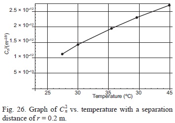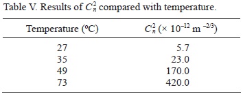 Table IV presents the refractive index structure constants C2n from various published data. As previously explained, the values vary from one source to the other and their relevance is highly interpretive for specific conditions. Numerous factors, such as wind speed, humidity and mean temperature need to be considered before the data can be directly compared to our work. However, we are able to immediately ascertain a common trend in this work and all comparative data: C2n is temperature dependent. To graphically analyze and verify this trend, it may be necessary to plot a few scenarios of C2n vs. temperature from various sources.