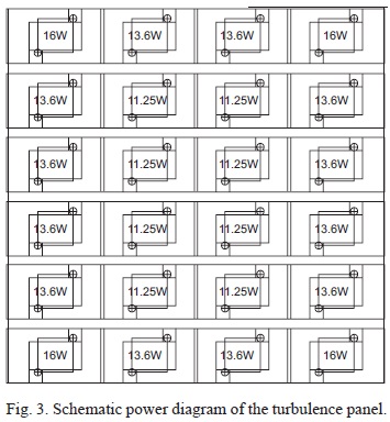Turbulence was created by a specially manufactured 20 x 20 x 1 cm heated aluminum panel. Arranged on the underside of the panel was an array of high-powered resistors that were fixed into position using steel nuts and bolts. The electronics department carefully constructed an arrangement of resistors such that consistent heating existed above the panel. This was achieved using a surface temperature probe to measure the temperature at different points on the panel, and thereafter placing appropriate resistors to accommodate their position. The aluminum panel was snugly placed in a case on a bed of fire blanket, which insulated it from external factors. The resistors varied in their resistances, according to Figure 2 (which presents resistance values in ohms, Ω), with the corresponding power values represented in Figure 3. Both figures explicitly show the arrangement of the resistors on the panel.