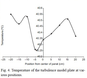 Clearly from Figure 4, the heated panel is successful in maintaining a uniform heat distribution along the surface of the panel with a standard deviation of 9.7 x 10-2 °C. The turbulence generated by the model was, therefore, effective in modeling an inhomogeneous and isotropic environment within an area of 0.04 m2.