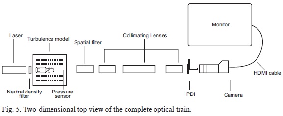 We consider a laser beam propagating through an inhomogeneous medium. The laser beam propagates through the following optical components: a microscope objective lens, the turbulence model and pressure sensor, a series of collimating lenses, a spatial filter, a point-diffraction interferometer and finally is captured on a camera. The camera acts as a detector to take photographs of the interferograms and display the interference pattern on a monitor. The entire setup is mounted on height-adjustable rails to vary the separation between the laser beam and the turbulence generator. The lowest height setting has been used in this work, corresponding to a separation of 28 mm between the laser beam and the turbulence source. Figure 1 presents a schematic diagram of the apparatus showing the complete optical train.
