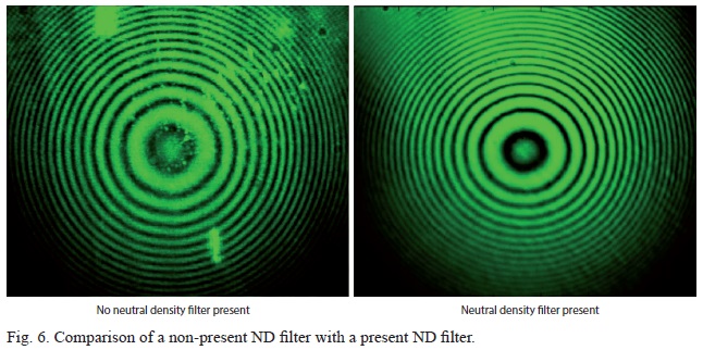 A reflective 50 x 50 mm 2.5 OD neutral density filter of 2.0 mm thickness was positioned immediately after the laser, since it served the purpose of reducing any stray light in the produced interferograms. Some filters considerably reduced the intensity of the light falling upon the PDI, hence numerous tests were conducted to determine the most effective filter whilst ensuring bright, clear interferograms that could be characterized. Examples of interferograms are presented in Figure 6. One of them (in the left panel) does not have an neutral density (ND) filter, while the other one (in the right panel) has it. The interferogram to the left shows random light artifacts that are not filtered out by the spatial filter and collimators. The interferogram to the right used the abovementioned ND filter to produce a flawless image, clearly depicting a Gaussian form profile for an unperturbed laser beam. A more descriptive discussion of the profile is provided in the results section. With the correct ND filter chosen and in place, the proceeding collimators were moved back and forth to yield a focused beam at the PDI pinhole. By doing so, a Gaussian form intensity profile was produced which provided stable and clear interferograms. At all times, alignment was perilous and utmost care was taken in ensuring a centralized beam. The final component in the optical train was the DSRL camera, which was positioned to receive the laser beam at the center of its aperture.