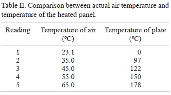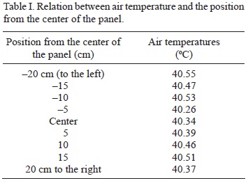 The temperature range was controlled between 0 and 180 °C using a proportional integral derivative (PID) controller. The device served the purpose of setting, monitoring and controlling the temperature of the panel. Temperature measurements were taken using a sensitive J-type thermocouple with a two-decimal precision. Table I shows the results obtained from the experiment for temperature vs. the position from the center of the panel, with the center point represented by 0 cm. Negative values represent a position to the left of the center and positive values represent a position to the right. The temperature of the PID was set to a value of 100 °C, which corresponds to the temperature of the panel as determined by using a surface temperature probe. Sufficient time was given for the air temperature to stabilize before readings were taken.