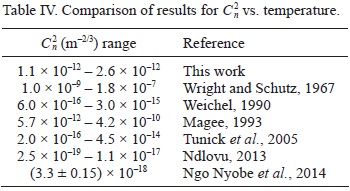 Varying values of C2n are tabulated in Table IV. The higher values of C2n, as described by Ngo Nyobe et al. (2014), describe a highly turbulent atmosphere and predict a high level of visual blurring such as the wavy lines one may encounter when looking at a hot metal surface. Lower values of C2n as described by Ndlovu (2013), indicate more adiabatic conditions such as in windy or cloudy conditions. Figure 27 is a plot of C2n versus temperature as obtained experimentally by Magee (1993), who introduced a turbulent environment within a turbulence chamber in the laboratory and measured the perturbed wavefront using a shearing interferometer, which allows direct comparison with our own results. Table V presents the data for the plot in Figure 27.