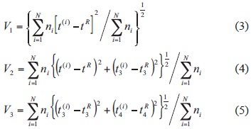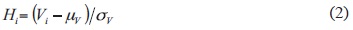 where μV and σV are the mean and standard deviation of Nsim values of V (Nsim is the number of simulation data). Vi is calculated from the regional data, based on the corresponding V-statistic defined as follows: