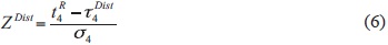 where t4R is an average L-kurtosis value computed from the data of the region, T4Dist is a theoretical L-kurtosis value computed from the simulation for a fitted distribution, and σ4 is the standard deviation of L-kurtosis values obtained from simulated data. The fit of a distribution is considered satisfactory if |ZDist| < 1.64. When more than one distribution qualifies for the goodness-of-fit measure, the preferred distribution will be the one that has the minimum \ZPDistl value.