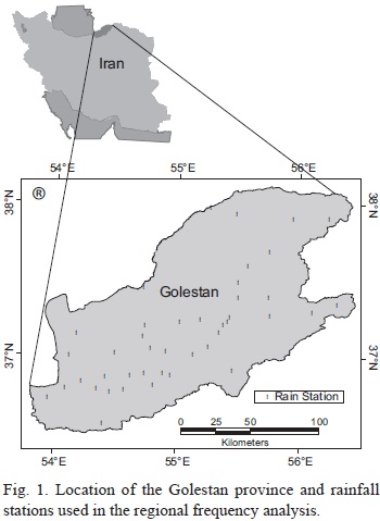In the present study, daily rainfall data of 47 gauge stations, compiled by the Iranian Meteorological Organization and also by regional water resources departments, have been analyzed. The study was limited, by necessity, to daily data, as sub-daily data are not generally available with sufficient coverage and length of record. New time series of annual maximum daily data are then abstracted from these daily data. In addition, information on longitude, latitude, and mean elevation above sea level was also obtained for each site. Figure 1 shows the location of the Golestan province and the 47 rainfall gauge stations, with basic information presented in Tables I and II.