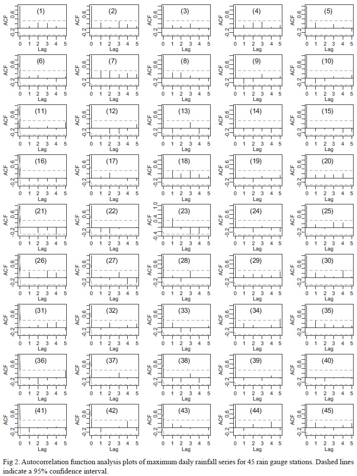 The values of the autocorrelation coefficients for lags 1 to 5 are plotted in the correlograms presented in Figure 2, where the dashed horizontal lines are intended to give critical values for testing whether or not the autocorrelation coefficients are significantly different from zero. It can be seen that for almost all stations autocorrelation coefficients are within the critical bounds, thus we might well consider the maximum daily rainfall series as time-independent.