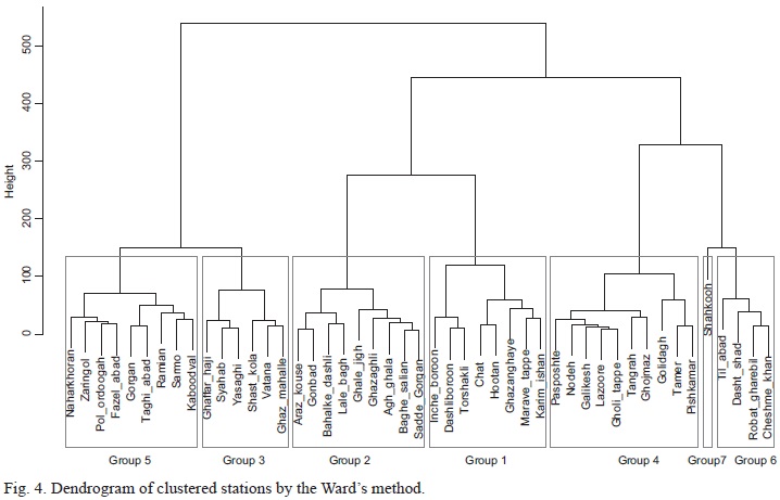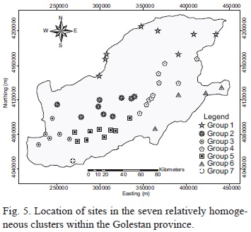 Due to the complex geographic and hydro-climatological characteristics of the region, an important research issue focused on breaking down the large area into homogeneous and coherent sub-regions. The area of the Golestan province was divided into five homogeneous regions, based on the cluster analysis of site characteristics and tests for regional homogeneity. The site characteristics utilized in this study enabled relatively homogeneous regions of extreme rainfall within Golestan to be easily identified, with minor subjective interventions. Nevertheless, followed by the recommendation by Kysely et al. (2007) it should be noted that, since the regions configured are not only homogeneous as to the statistical characteristics of extreme rainfalls, but also reflect climatological differences in precipitation regimes and synoptic patterns causing heavy precipitation, their future application may not be limited to the frequency analysis of extremes.
