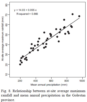 The procedure for estimating rainfall quantiles at ungauged sites is similar to that for gauged sites except that an estimate of the at-site average maximum rainfall must be obtained from other sources or other methods. Investigations revealed that there is a strong relationship between l1 and mean annual precipitation in the Golestan province (Fig. 8). The following equation was developed to estimate l1 values at ungauged sites in Golestan: