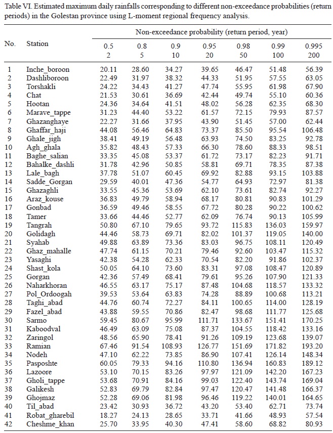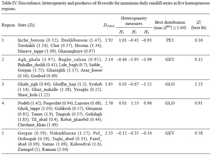 The result of the discordancy test indicated that four stations, namely Vatana (in region 3), Pishka-mar (in region 4), Karim-Ishan (in region 4), and Dasht-shad (in region 6) were discordant with the other stations in their groups. These stations were deleted after it proved impossible to reassign them to other regions. Region 6, which had three stations, was merged with region 4 based on geographical and physical conditions. The combined region was homogeneous (Hi = 0.01). Region 7, which contained only one station (Shahkooh), was also removed because assigning it to adjacent regions would cause them to be heterogeneous. After modification of the initial regions, the final number of regions was reduced to five, all of which were acceptably homogeneous (H1 < 1) with no discordant stations as indicated in Table IV.