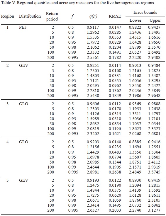 For each homogeneous region, the best-fit distribution of regional data was used for estimating dimension-less regional frequency distribution (regional growth curve). The bias, RMSE, and 90% error bounds of the estimated growth curves were calculated through the Monte Carlo simulation procedure. The results are given in Table V and Figure 7. It is evident from the figures that uncertainty of the regional quantiles increases with the return period. The RMSE values of the estimated growth curves for five homogeneous regions range from 0.011 to 0.19 when return periods of rainfall extremes are less than 100 years. However, high RMSE values and error bounds are noted in the upper tail, suggesting the unreliability of quantiles with return period T > 100 years.