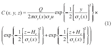 where He is the effective stack height, the coefficient σy was derived empirically, and σz was derived theoretically as a function of downwind distance and stability.