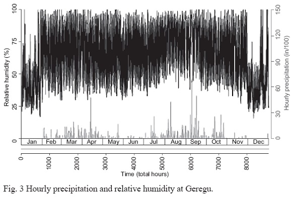 Based on a nationwide study of the annual rainfall in Nigeria, the modeling domain lies within the region with relatively moderate rainfall and a dry season in November through January. The deposition rate should be higher in April, May and the third quarter of the year. During these periods, the hourly precipitation is high. Figure 3 demonstrates the variation of the hourly relative humidity with seasons.