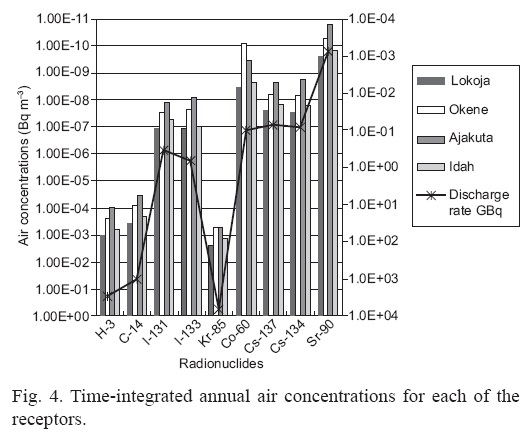 4.1 Results of the normal operations simulation The scaling factors were obtained by assuming a unit release (1 Bq h-1), since this facilitates the future updating of the assessment. The scaling factors and the annual average discharge for each of the radionuclides (Table I) were then used to obtain the integrated annual air concentrations and ground depositions of the radio-nuclides in each of the receptors. These are presented in Figures 4 and 5, respectively. Data in Figure 4 is presented in a natural log scale and in reverse order.