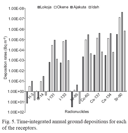 The maximum depositions of 85Kr were observed in Lokoja and Idah. The ground depositions of the iodine and cesium isotopes were eight and nine times lower in order of magnitude than the ground deposition of 85K (the maximum value was 2.96 x 101 Bq m-2 for Lokoja). The minimum deposition of cesium and strontium isotopes, with values of 2.35 x 10-6 B qm-2 and 2.35 x 10-8 Bq m-2 of 137Cs and 90Sr, respectively, was found for Ajaokuta.