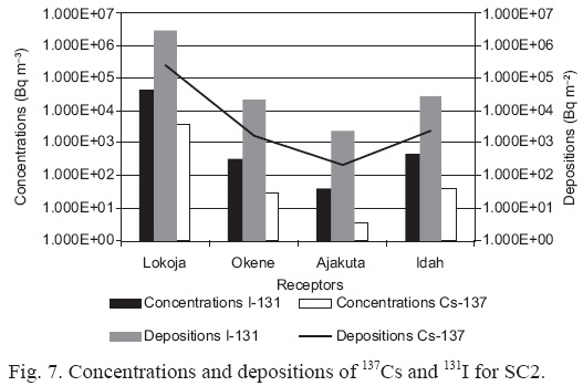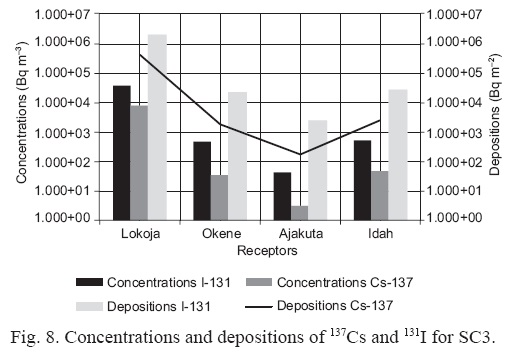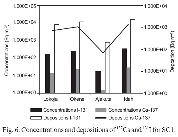 The ground depositions of contaminants (137Cs and 131I ) were relatively low due to the null precipitation that is typical of SC1. The advantage of the meteorological condition of SC1 is that pollutants' concentrations were diluted by unstable wind. The concentrations and depositions were higher at Idah and Okene, due to the predominant wind direction between hours 10 and 24 (Fig. 6).