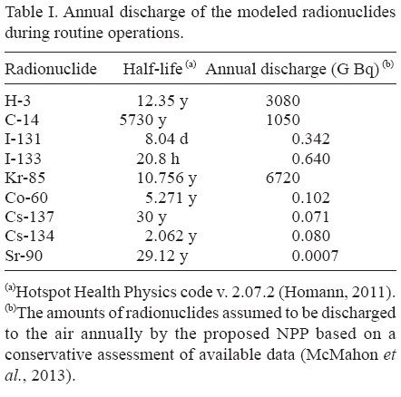 Annual scaling factors for air concentrations and ground deposition of radioisotopes were used to estimate time-integrated values of the concentrations and depositions of the respective radionuclides during routine operations of the NPP. Although conservative values were adopted for the annual discharge of radionuclides, the study shows that, under normal operation, the NPP would not pose any significant health and environmental hazards.