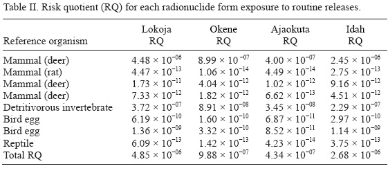 Table II presents the RQ for each of the radio-nuclides for all receptors obtained using the ERICA Tool. Since the generic reactor releases are controlled during normal operations, the probability of exceeding the screening dose (10 uGy h-1) is acceptably lower than 5%. With this result it was recommended that the assessment be terminated at that stage. What is unique about Table III is that it also presents the total RQ for each of the receptors and the corresponding reference organisms that will be at risk. The total RQs for Lokoja and Idah are one fold higher in order of magnitude than those of Ajaokuta and Okene. This variation in the total RQ is determined by the ground level air concentrations of the isotopes.