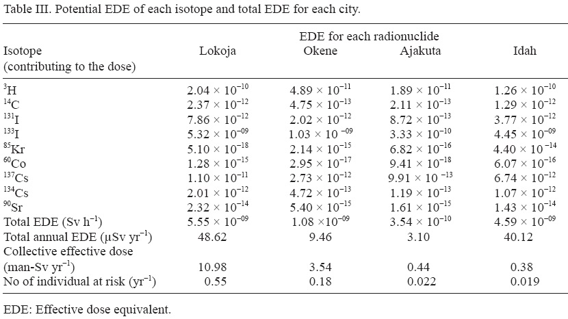 Table III presents potential effective dose equivalents (EDEs) for each isotope. The total annual EDE was obtained by summing the doses for each isotope in each city assuming that the reference population has a daily breathing rate of 22.2 m3, and it spends one third of its time on the contaminated ground; and also by assuming homogeneous concentrations and depositions of the radionuclides in the receptors.