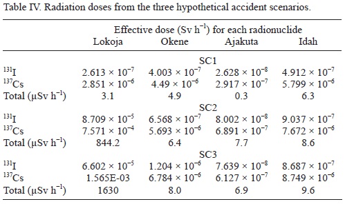 Table IV presents the radiation doses that could be associated with each of the simulated scenarios due to their prevailing meteorological conditions. The ground level doses of SC1 are relatively lower than those of SC2 and SC3, as a result of the dilution of the plume's content by turbulent activities in the air, as the dispersion continued. As mentioned before, the human doses of SC2 and SC3 in each of the cities are higher due to the wet scavenging of the pollutants. In the third scenario, the public dose was higher than in the first two cases because the receptor location (Lokoja) was the most exposed. However, it is important to mention that although this information is relevant for emergency preparedness, radiation carcinogenesis is a complex phenomenon. The results in Table IV are in agreement with those of Aliyu et al. (2014a), which adopt the GENII model for dose calculations on humans.