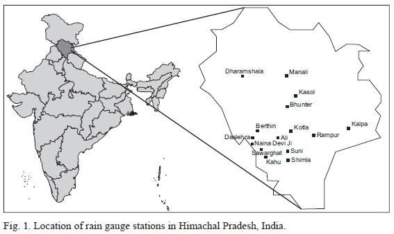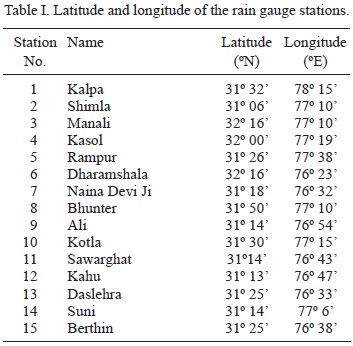 In the present study we used daily precipitation data of 15 rain gauge stations at Himachal Pradesh for the period 1977 to 2007 during winter months (December to March). The sources of data are the Bhakra Beas Management Board and the India Meteorological Department. Locations of the rain gauge stations are given in Table I and shown in Figure 1.