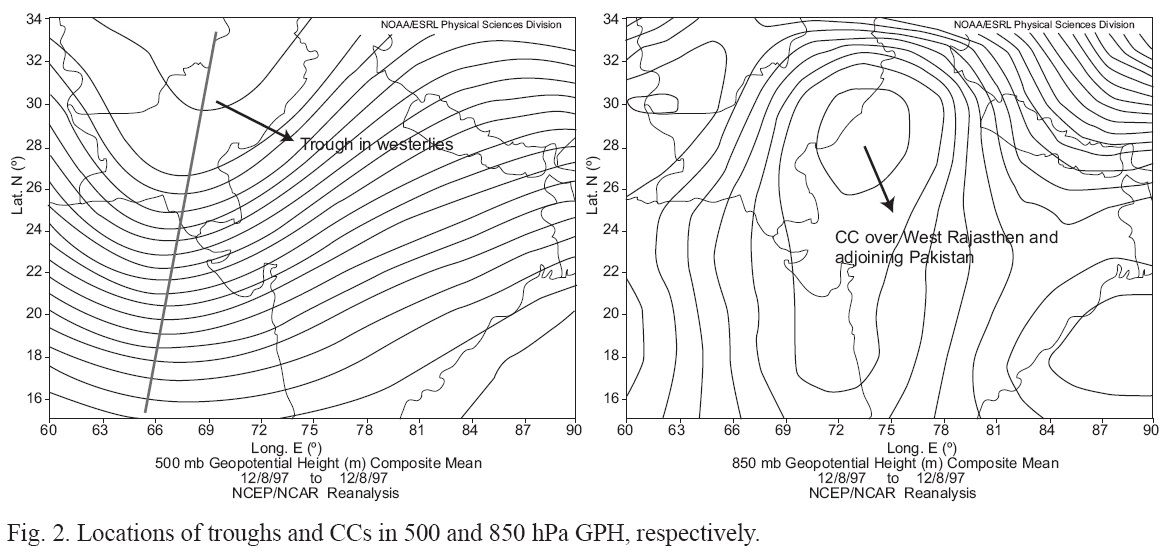 A typical example of a trough and induced CC associated with intense WDs that have caused widespread (at more than 75% stations) precipitation with heavy rainfall in a few places (more than 25% of stations) is shown in Figure 2. The trough in 500 hPa GPH is roughly along 67° E longitude-16° N latitude along with an induced CC over west Rajasthan and the adjoining Pakistan area at 850 hPa GPH.