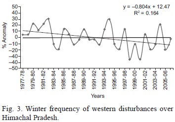 The mean frequency of winter WDs that caused precipitation over Himachal Pradesh is 12, with a highest monthly frequency (four) during February and March. This study shows a significant decreasing trend in the frequency of WDs over Himachal Pradesh.