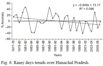 Time series of wet and rainy days are shown in Figures 5 and 6, respectively. Our study shows a decreasing trend both in wet and rainy days. A decrease of about 14% and 13% was found for wet and rainy days, respectively, from their respective means during the 1977-2007 period. Kumar and Jain (2010) also observed a decreasing trend in winter rainy days over the Kashmir Valley in the Himalayas.