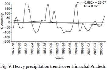 Time series of rather heavy and heavy precipitation days are shown in Figures 8 and 9, respectively. Both series show decreasing trends over Himachal Pradesh during the study period. The analysis indicates a decrease of about 12% and 25% in rather heavy and heavy precipitation days from their respective means during the 1977-2007 period. However, long-term changes in heavy precipitation events are not uniform over different parts of the India. Goswami et al. (2006) found significant increasing trends in extreme heavy precipitation over central parts of the country. Kishtawal et al. (2009) observed a significantly increasing trend in the frequency of heavy rainfall over urban regions of India during the monsoon season. Guhathakurta et al. (2011) observed decreasing frequency of heavy rainfall events over major parts of central and north India and increasing frequency in peninsular, east and northeast India. Kumar et al. (2012) observed decreasing trends in heavy precipitation over the Andaman and Nicobar islands.