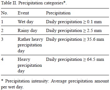 If daily data of a particular month is lower than 80% in a station, the data of that month is discarded. To study the precipitation indices (Kumar et al., 2012; Brunetti et al., 2000), we divided daily precipitation into the categories shown in Table II.