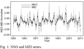 To construct contingency tables for evaluating the relationship between rainfall and the warm/neutral/ cool events, we considered monthly time series from 1951 through 2011 for the Southern Oscillation Index (SOI) and for equatorial SST represented by the series Niño 3.4 (N34, monthly SST averaged over 5° N-5° S and 150-160° W). We summarized both into an index that we call Niño Southern Oscillation or hereafter NSO (to distinguish it from the conventional ENSO acronyms), which considers both the atmospheric and oceanic contributions ofthe coupled phenomena. NSO is defined as the difference N34-SOI of standardized contemporaneous monthly values. The purpose ofthis index is to focus the analysis on the events in which there is a coupling between the atmosphere and the ocean. The relationships between ENSO events and the NSO index are clear, since during the warm (cool) phase of ENSO, SST has positive (negative) anomalies and SOI has negative (positive) anomalies, so that the NSO has its maximum (minima) for El Niño (La Nina) events. As such, the NSO index has the advantage of summarizing in a more simple and straightforward manner the information given by both indices. When NSO is compared, for example, with Wolter's MEI index (Wolter, 1987; Wolter and Timlin, 1993) a good correspondence is found (Fig. 1). The NSO index emphasizes extreme events, which helps in the differentiation of terciles for this analysis.