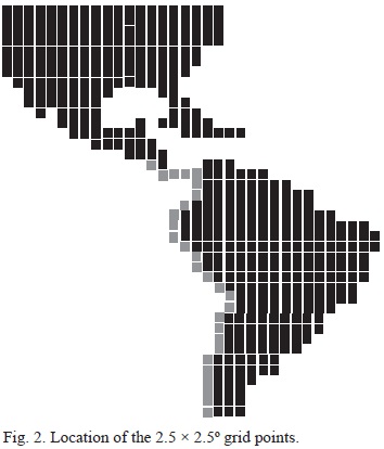 Monthly rainfall (R) data were obtained from the National Centers for Environmental Prediction (NCEP) of the National Oceanic and Atmospheric Administration (NOAA), corresponding to the anomalies of worldwide rainfall measures over a 2.5 x 2.5° latitude-longitude grid from 1951 to 2011 (Chen et al., 2002). From the database we selected 28 grid points located along the west coast of South America from 25° N through 45° S (Fig. 2). Chen et al. (2002) describe that their global analyses are defined by interpolation of gauge observations over land. Their analyses are derived from gauge observations from over 17 000 stations collected in the Global Historical Climatology Network (GHCN), v. 2, and the Climate Anomaly Monitoring System (CAMS) datasets. To determine the most suitable objective analysis procedure for gridding, the analyses generated by four published objective analysis techniques (those of Cressman, Barnes, and Shep-ard, and the optimal interpolation [OI] method of Gandin) were compared. Based on their results, the OI technique was used to create monthly gridded analyses of precipitation over the global land areas. In addition, the mean distribution and annual cycle of precipitation observed in their data set showed good agreement with those in several published gauge-based datasets, and the anomaly patterns associated with ENSO resemble those found in previous studies (Chen et al., 2002).