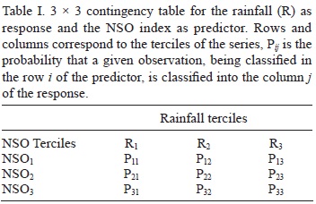 Pij probabilities can be interpreted as follows: P11 is the probability that the first tercile of NSO induces rainfall in the first tercile of the rainfall Table I. 3 x 3 contingency table for the rainfall (R) as response and the NSO index as predictor. Rows and columns correspond to the terciles of the series, Pij is the probability that a given observation, being classified in the row i of the predictor, is classified into the column j of the response.