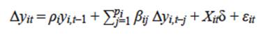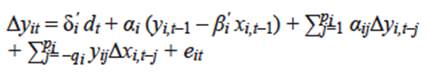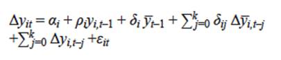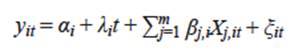 where t = 1.,...,N and i = 1,...,N index the time-series and cross-section units respectively, and d t contains the deterministic components, typically these elements include a constant and a linear trend; to allow for this, there are three different cases. In the first case, d t = 0, so ∆y it has no deterministic terms (this is the most restrictive case); in the second case, d t = 1 so Δy it is generated with a constant (the deterministic component is an individual intercept); in the third case, d t = (1,t)' so Δy it is generated with both a constant and a trend.
