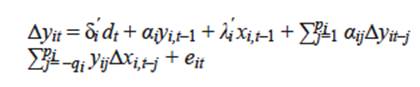 The long-run relationship between the variables is analyzed with the Westerlund (2007) cointegration test, which includes cross-section dependence in the cointegration equation. This test assumes the following data generating process: