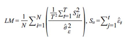 The Hadri test, unlike the previous tests, has as null hypothesis stationarity in all units against the alternative of a unit root in all panel members. Hadri’s (2000) statistics can be written as: