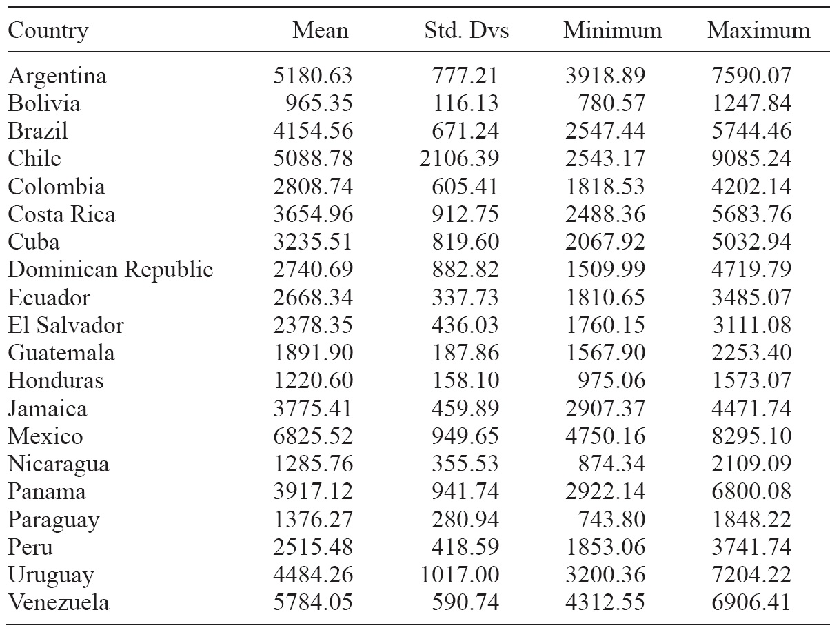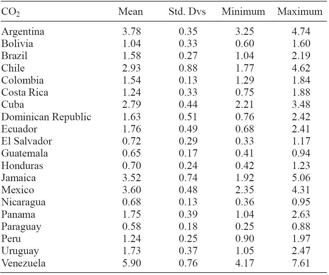 We focus our analysis on 20 Latin American and Caribbean (LAC) countries over the period 1971-2011. Per-capita CO2 emissions and real GDP per-capita were obtained from the 2015 World Development Indicators. Table I shows the descriptive statistics of the panel. In Table 1A country statistics are shown.