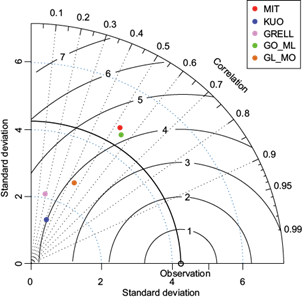 The Taylor diagram depicted in Figure 4 represents spatial correlation, standard deviation and RMSE between modeled and observed temperature (CRU). The design of the diagram considers the average of seasonal (JJAS) surface temperature for three years. It shows that the model performs reasonably well with all the CCS. The highest correlation (~0.97) and lowest RMSE (~2.1 ºC) are obtained using GL_MO, while the modeled standard deviation is almost equal to the observed one using KUO and GRELL. The other three schemes show a slightly higher standard deviation (7.5 ºC), which infers that spatial distribution and accuracy are better simulated by the model with GL_MO followed by MIT and GO_ML, with slightly higher variations than the CRU observation.