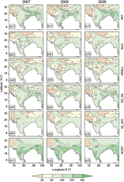 The difference in the model simulated rainfall between 2007 and 2009 (figure not shown) is analyzed to understand the fidelity of the model in producing yearly variations. It is observed that the model is able to simulate less rainfall in 2009 compared to 2007 over NWI, peninsular India, foothills of the Himalaya and NEI using MIT and GO_ML. The rainfall difference is minimal and not distinguishable in the model simulation using KUO and GRELL.
