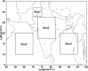 The model-simulated monthly mean surface temperature for JJAS (figure not shown) in 2009 (a draught year) shows a weaker heat low located over a smaller area. This is in agreement with the IMD monsoon report for that year. Dynamics of the monsoon circulation mostly depend upon the land ocean temperature gradient over the Indian subcontinent during the monsoon period. To analyze this aspect, four grid boxes (based on Mohanty et al., 2002) are introduced as shown in Figure 6, Box1 over NWI (70-75º E, 28-32º N), where the heat low dominates during monsoon season; Box2 over central India (72.5-82.5º E, 17.5-27.5º N); Box3 over the Arabian Sea (60-70º E, 10-20º N) near the east of Somalia coast, and Box4 over the Bay of Bengal (85-95º E, 10-20º N). The differences in the area averaged surface temperatures between these boxes in the month of May are computed and compared with NCEP/NCAR data due to non-availability of CRU temperature data over the oceanic region. The temperature differences between Box1 and Box3 in 2007 (a normal monsoon year) and 2009 (a deficit monsoon year) are 5.19 and 5.11º C, respectively, in the simulation using MIT, whereas in the NCEP/NCAR reanalysis datasets they are 3.27 and 3.28º C, respectively. This implies that the model is able to reproduce the temperature gradient for the two contrasting years better than NCEP datasets. The temperature difference between Box2 and Box4 in the simulation using MIT and NCEP data are 2.18º C, 5.2º C, respectively in 2007, and 4.44º C, 5.5º C, respectively in 2009, which clearly indicates that the temperature gradient between central India and the Bay of Bengal shows inverse relationship with that between NWI and the Arabian Sea in contrasting monsoon years.